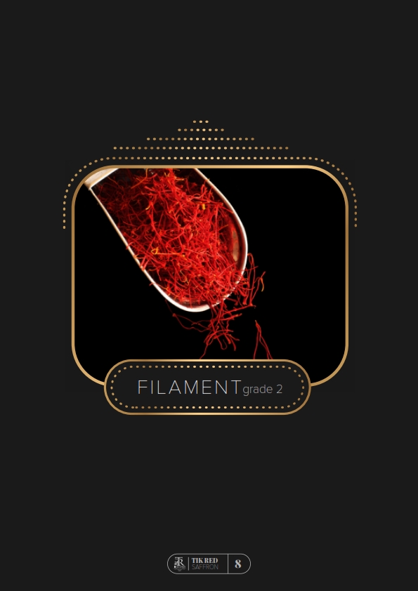– The entire saffron filament, 3 to 6 cm in size – The lowest level of saffron concentration, with a coloring (crocin) of 120 to 150 – Has many medicinal qualities